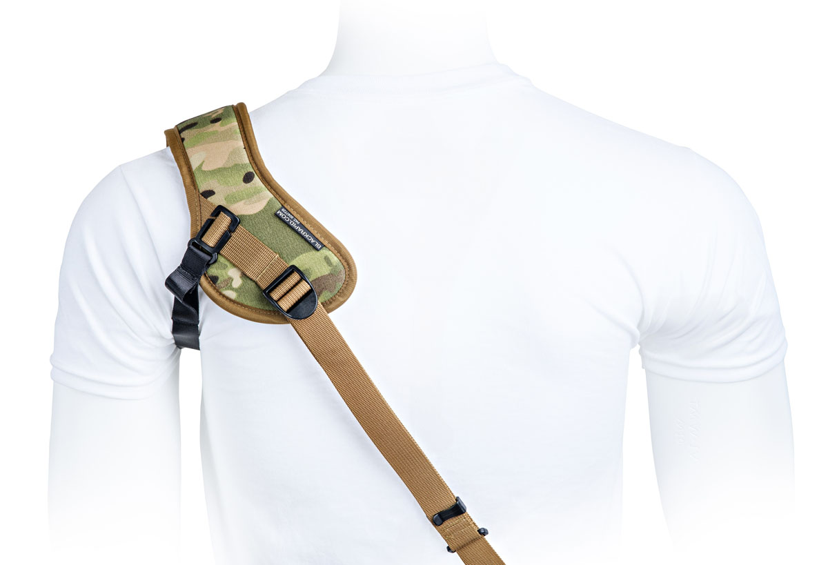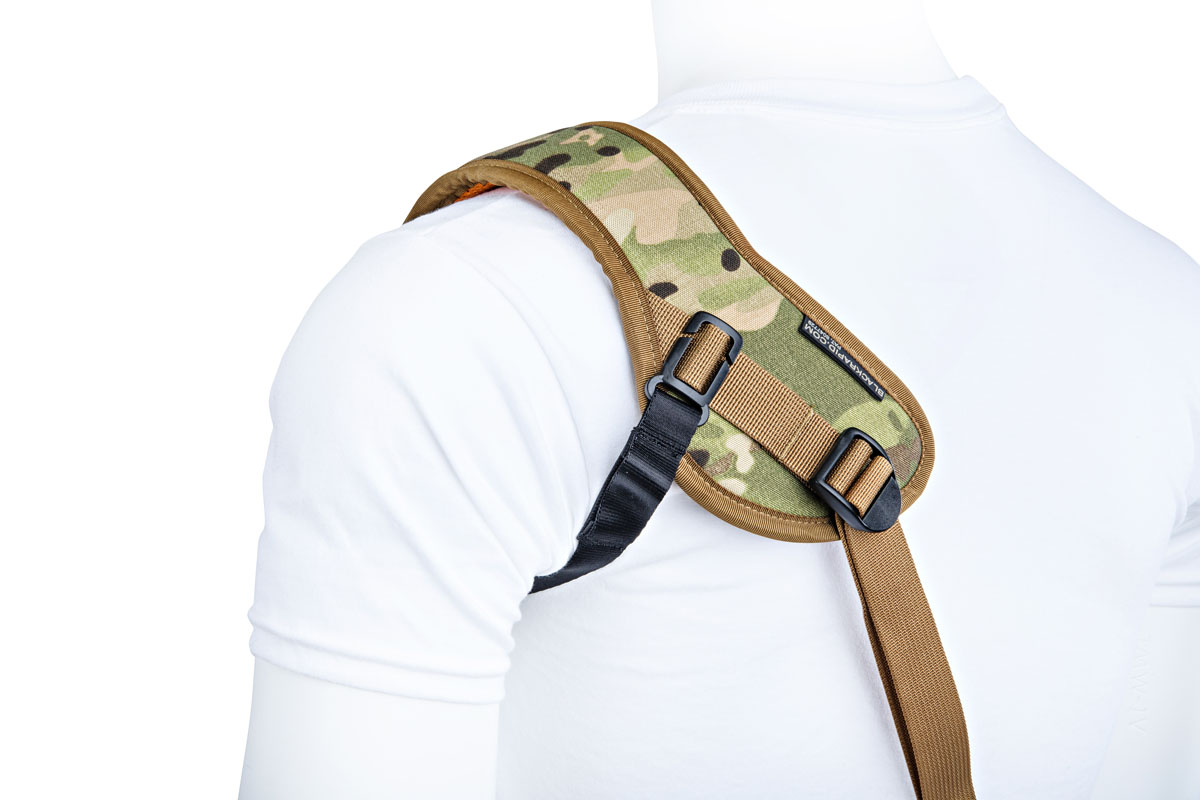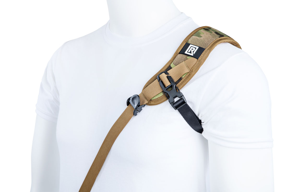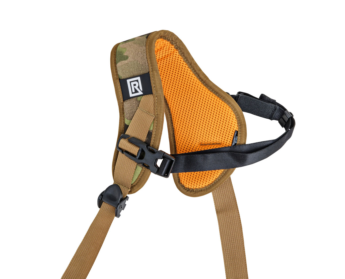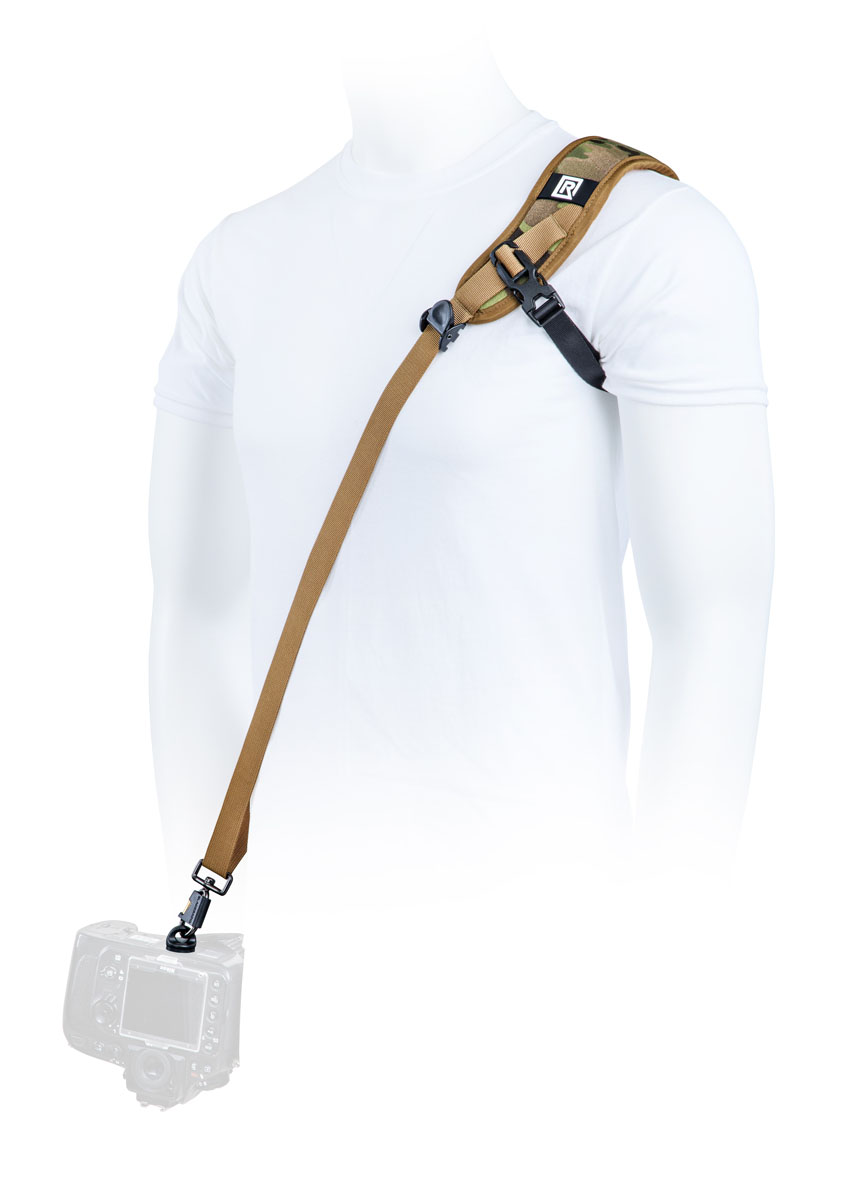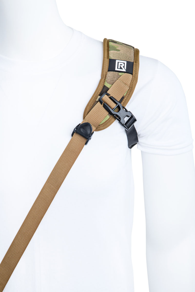 The strap is a single sling design that holds your camera tight on the shoulder with its included underarm stabilizer and is comfortable for all-day photo shoots. The strap is versatile and comes in multi-terrain camo, with an extra comfortable shoulder pad made of nylon mono mesh, ergonomically curved TPE foam, polyester.